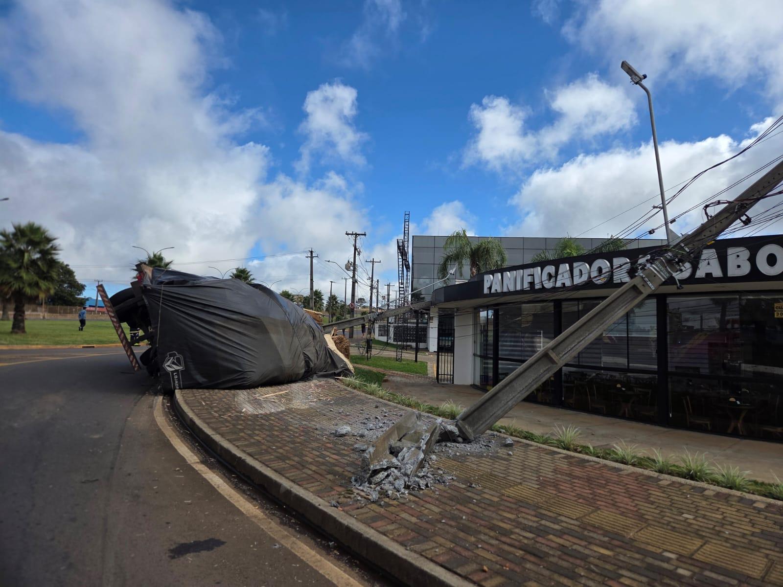 De acordo com o Corpo de Bombeiros de Guarapuava, a ocorrência envolveu um caminhão que transportava carga de compensados. Durante o tombamento, o veículo atingiu postes de alta tensão, derrubando a estrutura elétrica sobre um centro comercial.