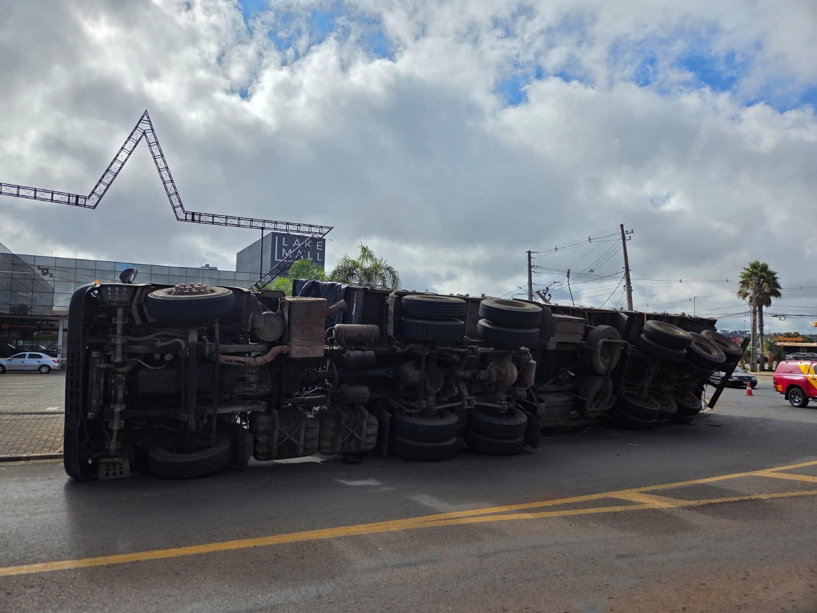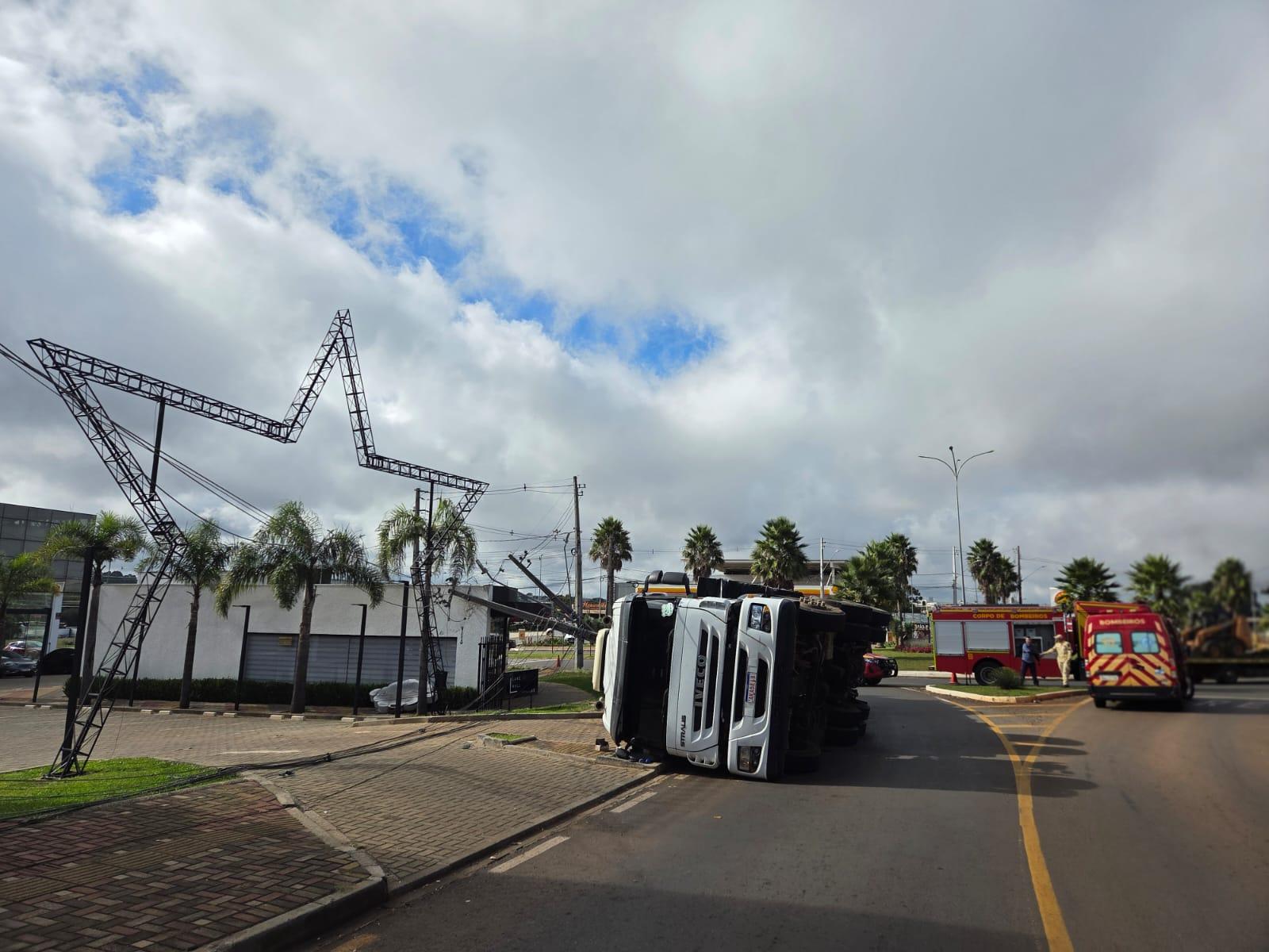 Um caminhão tombou na manhã deste sábado (18) na rotatória da Cidade dos Lagos, em Guarapuava, provocando transtornos no trânsito e interrupção no fornecimento de energia elétrica na região.