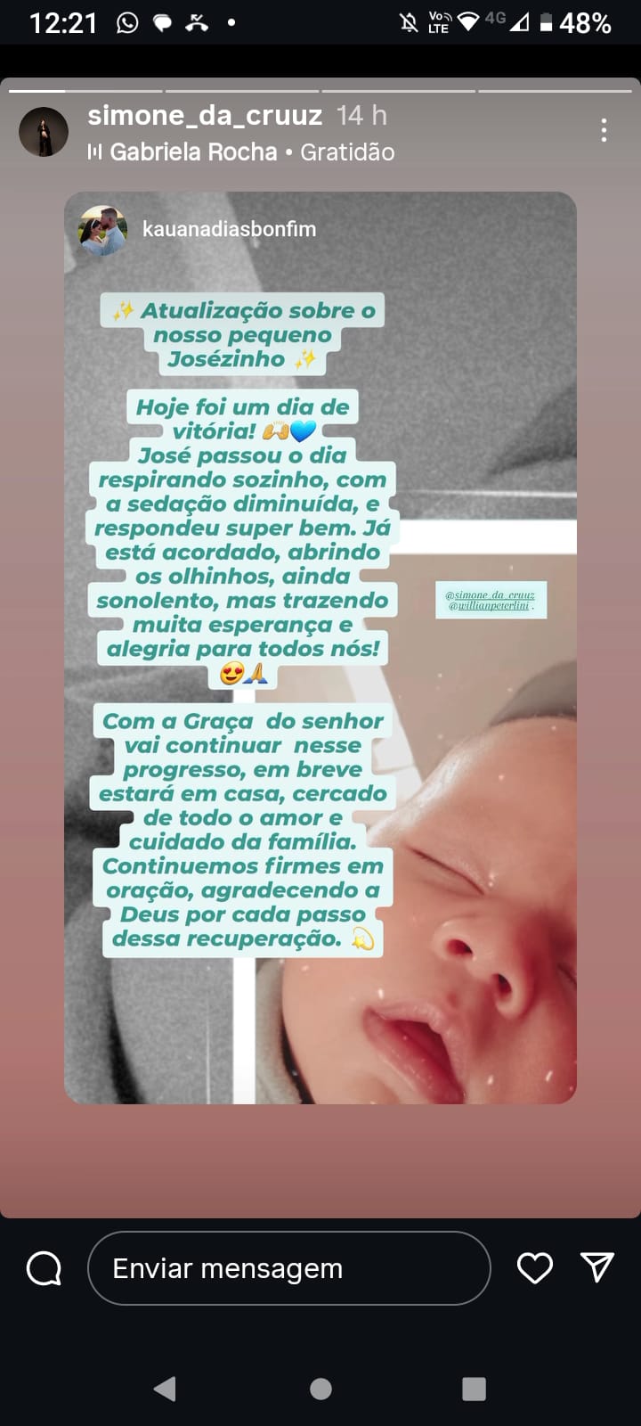 Boa notíciaRecém-nascido José apresenta melhora e respira sem aparelhos; família celebra vitória e agradece orações